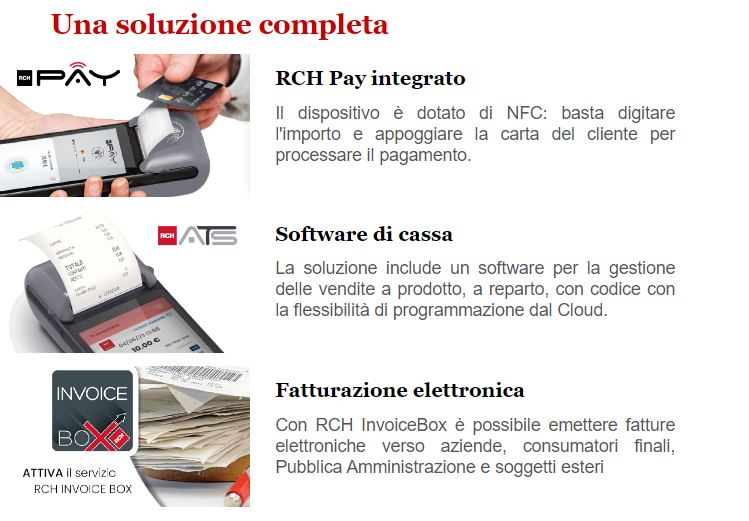 APE J – acronimo di Android Payment Evolution Job – è una soluzione studiata per il commercio ambulante, i liberi professionisti e le attività in mobilità. É un pratico dispositivo portatile per accettare pagamenti elettronici e in contanti. Dotato di tecnologia NFC, consente di effettuare gli incassi digitali grazie al servizio RCH Pay integrato: basta digitare l’importo e appoggiare la carta del cliente per processare il pagamento. Il registratore di cassa dispone anche di un evoluto software gestionale e di un modulo per la fatturazione elettronica in Cloud.