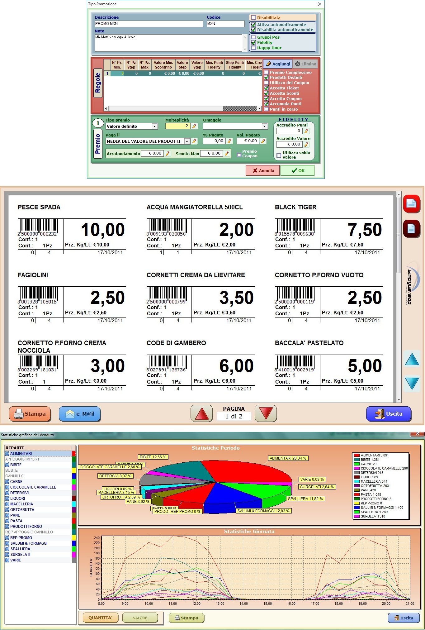E’ il gestionale che permette di configurare le anagrafiche (reparti, articoli, fornitori, clienti), di gestire uno o più magazzini (carico/scarico, inventario, sottoscorta, giacenza valorizzata), di stampare frontalini ed etichette, di programmare campagne promozionali e gestire tessere fidelity, di effettuare statistiche sul venduto, di curare la contabilità (DDT, fatturazione, gestione conti, scadenze e pagamenti, bilancio IVA e prima nota).