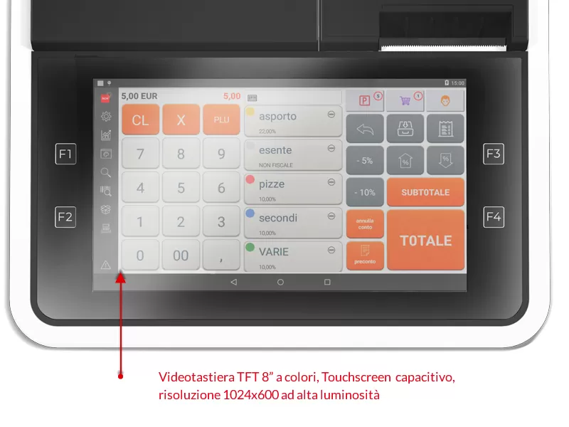 Il registratore telematico è dotato di Videotastiera TFT 8” a colori con Touchscreen capacitivo e risoluzione 1024×600 ad alta luminosità , stampante termica ad alta qualità grafica, easy loading per caricamento facilitato della carta che garantisce un elevato livello di prestazioni di gestione della vostra attività, oltre alla facilità d’uso e velocità del servizio.
